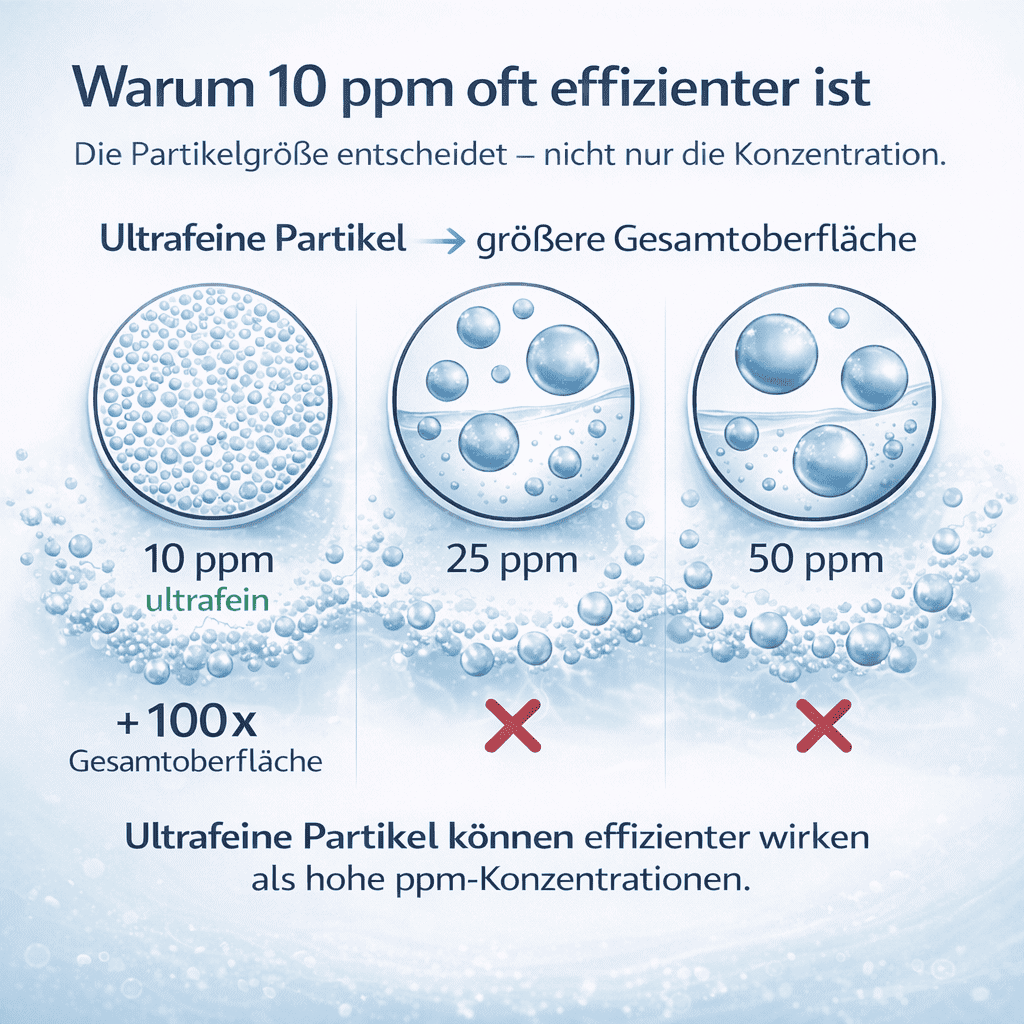 Silverlin setzt bewusst auf 10 ppm, da diese Konzentration die Herstellung extrafeiner, stabil verteilter Silberpartikel ermöglicht. Die feine Struktur sorgt für eine große Oberfläche bei gleichzeitig hoher Stabilität – ein entscheidender Qualitätsfaktor gegenüber höher konzentrierten Lösungen mit gröberen Partikeln.